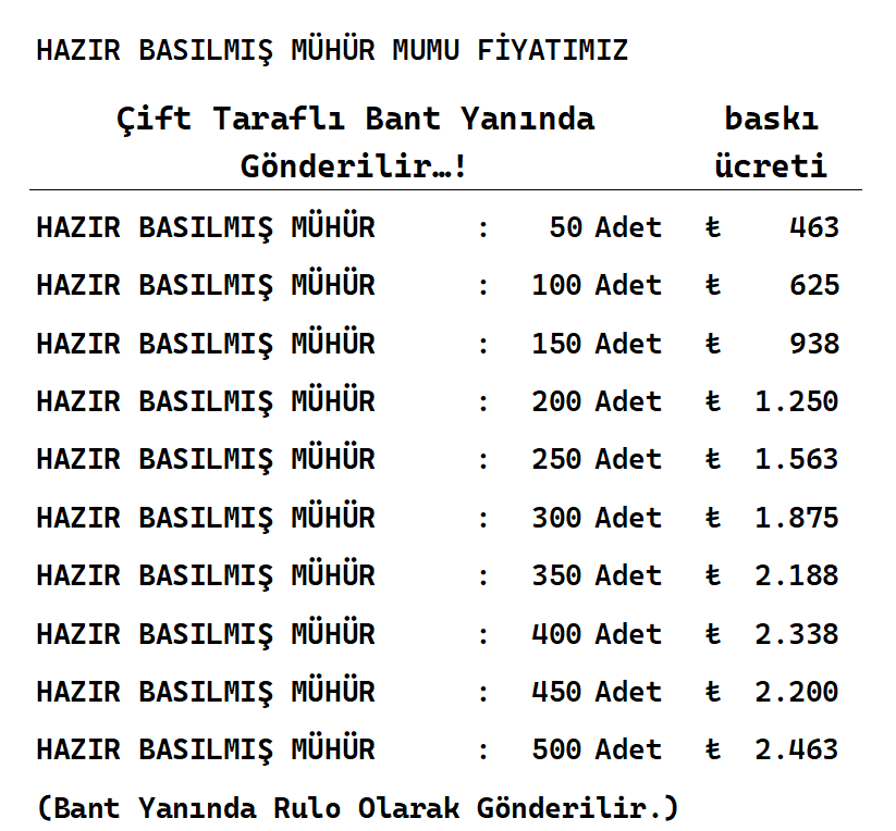 -Aşağıdaki fiyatlar 2,5 cm ve 3 cm lik hazır basılmış mühür mumlarımız için geçerlidir.
